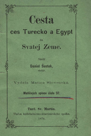 Cesta ces Turecko a Egypt do Svatej Zeme (The road through Turkey and Egypt to the Holy Land), an 1874 travel booklet written by Daniel Sustek. The booklet was published by Matica slovenska, the Slovak national cultural institution, in what was then Hungary. 1879Slovaks in Passaic, New Jersey, welcomed the first group of women who came to their community from Slovakia. When Hungarian authorities legislated that all men under the age of 50 must remain in the country to fulfill military service, the number of women emigrating increased markedly.