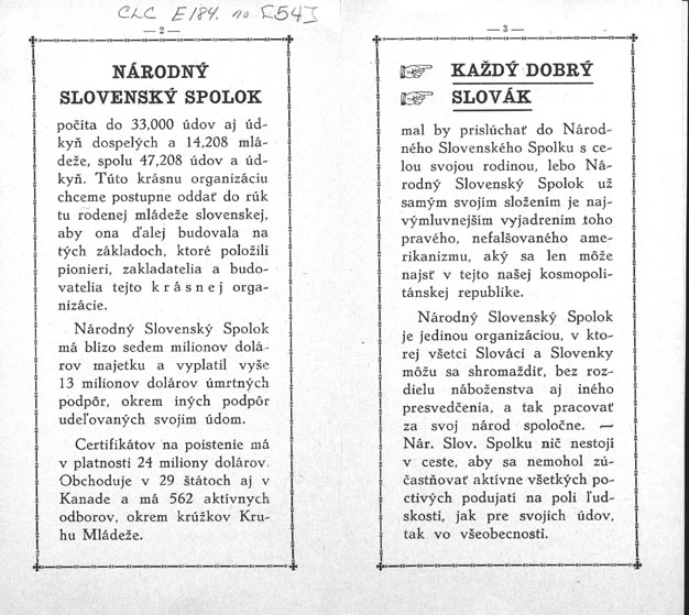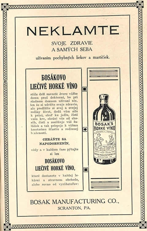 "Accepted Names of Languages," from Thirteenth Census of the United States. Country of Birth and Mother Tongue. Instructions to Clerks.... 1914Stefan Banic, a Slovak inventor, constructed and tested a prototype of a parachute in Washington, D.C., by jumping from a 41-floor building and subsequently from an airplane. His patented parachute became standard equipment for U.S. pilots during World War I. Banic worked in the United States from 1907 to 1920, with two interruptions. 1915The leaders of the Czech National Alliance and the Slovak League of America signed the Cleveland Agreement, in which they pledged to cooperate for the common goal of independent statehood for the Czechs and Slovaks. The agreement's five articles laid out the basics of a future joint state for the two nationalities. Michal Bosak, once acclaimed as "the richest Slovak in America," founded the Bosak State Bank in Scranton, Pennsylvania. Bosak came to the U.S. in 1886 at age 16 and initially worked as a miner, going on to become a businessman whose ventures included the Bosak Manufacturing Company (a wine and liquor distribution business), the Bosak State Bank, a travel agency, and several financial institutions in northeastern Pennsylvania. Bosak was also a leader in the Slovak-American community, becoming a signatory to the Pittsburgh Agreement and the publisher of the weekly newspaper {Slovenska obrana}. All of Bosak's business and banking ventures ended during the Great Depression. The Bosak State Bank, from Scranton: Official Publication Scranton [sic] Chamber of Commerce, vol.3, no.3, November 1927, Scranton. Advertisement for Bosak's Horke Vino, a wine-based elixir produced and distributed by the Bosak Manufacturing Company, fromObrana: Narodny kalendar, Obrana Publishing Company, Scranton, 1922. 1918The Pittsburgh Agreement was concluded by representatives of Czechs and Slovaks at a meeting of the American branch of the Narodni rada ceskoslovenska (Czechoslovak National Council) in Pittsburgh. The agreement endorsed a program for the struggle for a common state of Czecho-Slovakia and agreed that the new state would be a democratic republic in which Slovakia would have its own administration, legislature, and courts. 1923Reverend Jaroslav Pelikan was born in Akron, Ohio. He is a Lutheran theologian and one of the leading church historians of the 20th century. 1933Michael Novak, a prolific Roman Catholic theologian and political writer, was born in Johnstown, Pennsylvania. In his works, he became a spokesman not only for Slovaks, but for all ethnic groups in the United States as well, in such works as Concepts of Ethnicity and Unmeltable Ethnics: Politics and Culture in American Life. 1941Out of This Furnace, the story of three generations of Slovaks working in steel mills, was published by Thomas Bell (Belejcak), an American-born writer who depicted the lives of Slovak immigrants in many of his works.