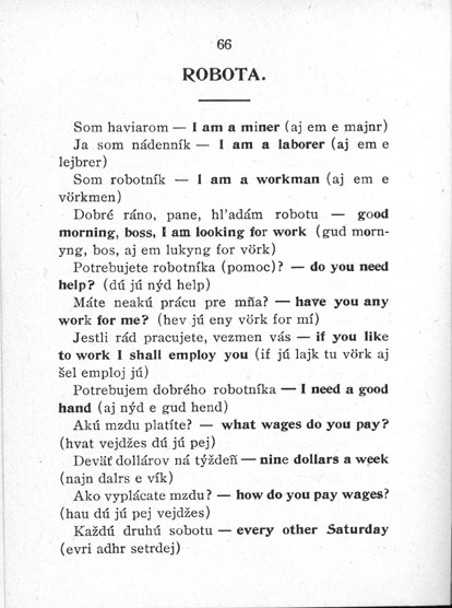 St. Mary's Assumption Roman Catholic Slovak Church in Passaic, c.1920. The parish was founded in 1891, but ground for this building was not broken until 1904. 1883The first Slovak beneficial society was formed in New York when a group of Slovaks, mostly from the eastern counties of Slovakia, met in a private home and organized The First Hungarian-Slovak Sick Benefit Society. The society's by-laws contained the provision that the eastern Slovak dialect be used as long as there were seven members in the society. Beneficial societies were formed as insurance societies and unions, but they also played cultural, social, and political roles. 1886The first printed Slovak newspaper, the Amerikanszko-szlovenszke noviny (Amerikansko-slovenske noviny), was published by Jan Slovensky. Circulation reached 30,000 at the end of the century under editor Peter V. Rovnianek. This was a larger circulation than that of any other Slovak paper of the time, even in Slovakia. 1887The First Coopers' Beneficial Society was founded in Bayonne, New Jersey. It was the first Slovak society to uphold the interests of workers and even negotiated with factory owners. ![]() A map of Bayonne, NJ, from All About Bayonne City, N.J., 1895. Americky tlumac  (American interpreter), the first Slovak-English dictionary serving the needs of the immigrants, was published by Jan Slovensky, in an eastern dialect. It readily became very popular because it aided the immigrants with their English language problems. Several other such works were published in subsequent years. A page from Prakticny slovensko-anglicky tlumac. The Practical Slovak American (sic) Interpreter, compiled by Paul Kadak in 1905, showing useful phrases concerning work.  1889Anton S. Ambrose (Ambrosi), a journalist who never completed his high school studies, founded the newspaper Slovak v Amerike, the oldest Slovak newspaper still in print in the United States. The first Slovak school in America was established by St. Stephen's Parish in Streator, Illinois.